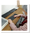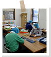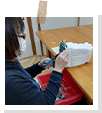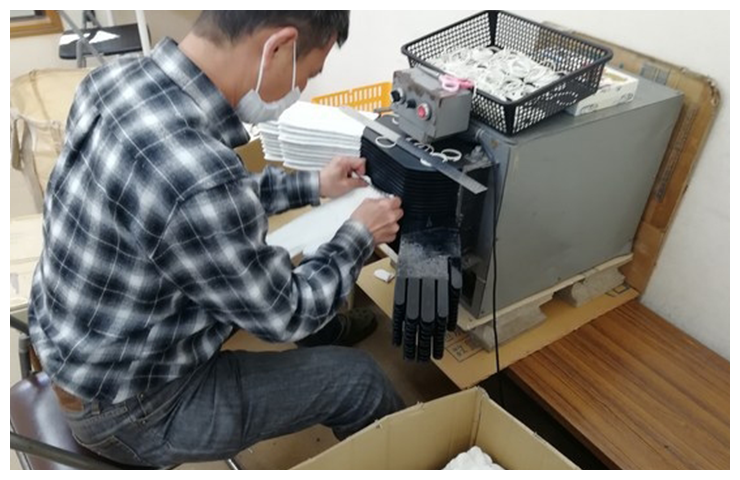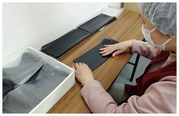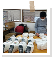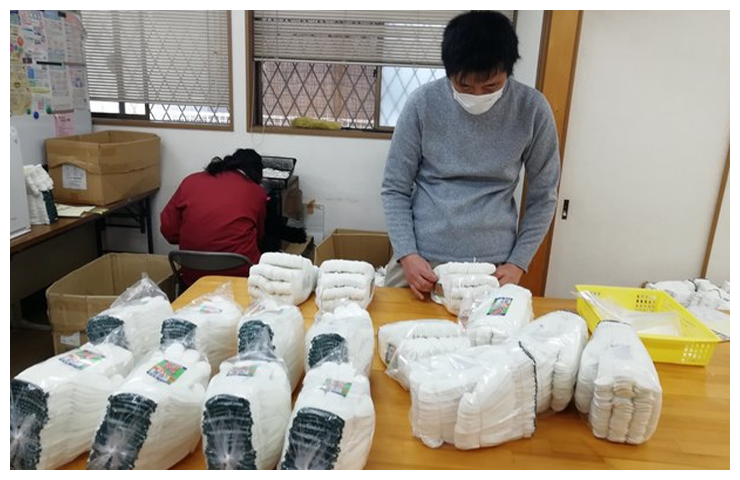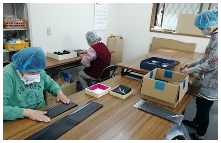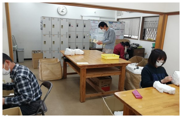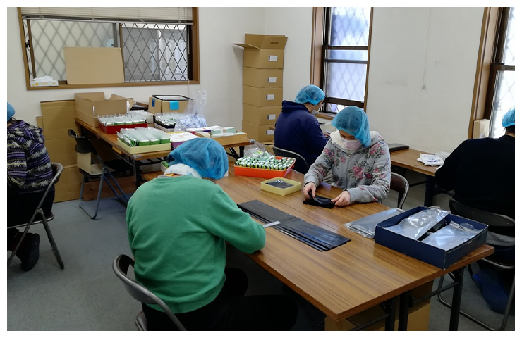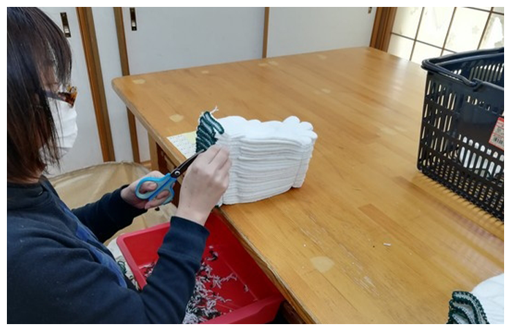 軍手:シールを貼って袋入れの仕上げや型入れをしています。 携帯トイレ:携帯用トイレの袋折りやセットする作業をしています。 袋たたみ:トラクターのエンジンを覆う大きな袋をたたむ作業をしています。